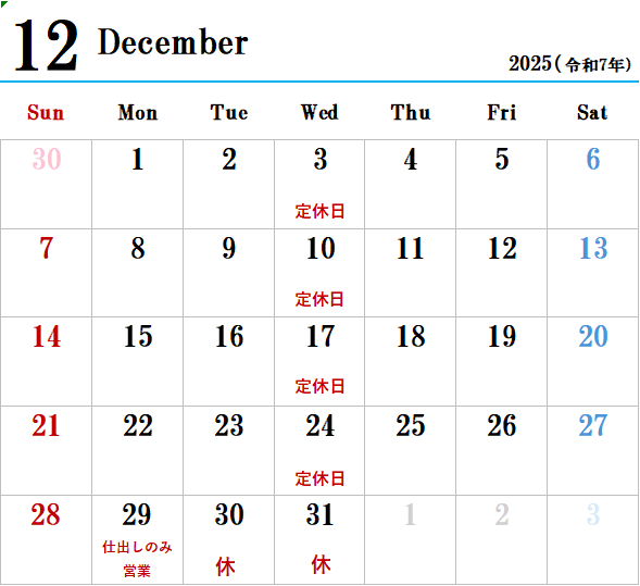 2025 1118 お知らせ 12月定休日のご案内 平素は格別のご高配を賜り、誠にありがとうございます。12月の定休日は上記の通りとなります。 Tweet Share Hatena Pocket RSS feedly Pin it 11月定休日のご案内 前の記事 2026年 1月定休日のご案内 次の記事